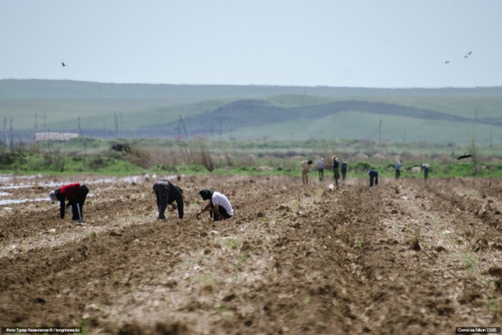 На полях вокруг Арыси молодые люди дружной компанией сажали арбузы.