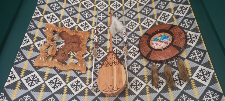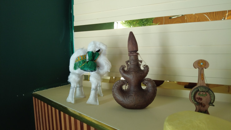 Внутри ресторана все напоминает о том, что ты находишься будто в мини-Казахстане: флаг, национальные музыкальные инструменты, головные уборы и т.д.