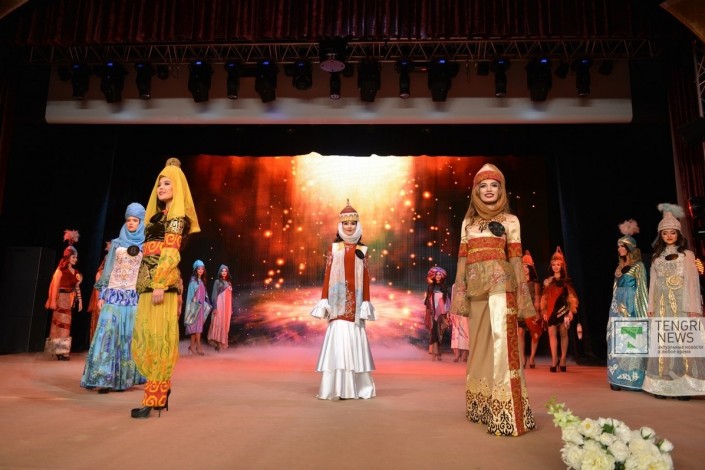 Второй этап конкурса - выход в национальных костюмах. Традиционные костюмы в этом году выглядели немного иначе, с намеком на арт-хаус. Музыкальное сопровождение также было соответствующее - казахские кюи в диджейской обработке.