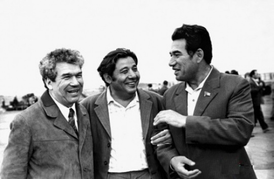 Писатель Мустай Карим, Калтай Мухамеджанов и Чингиз Айтматов. Фото с сайта kazakh-tv.kz
