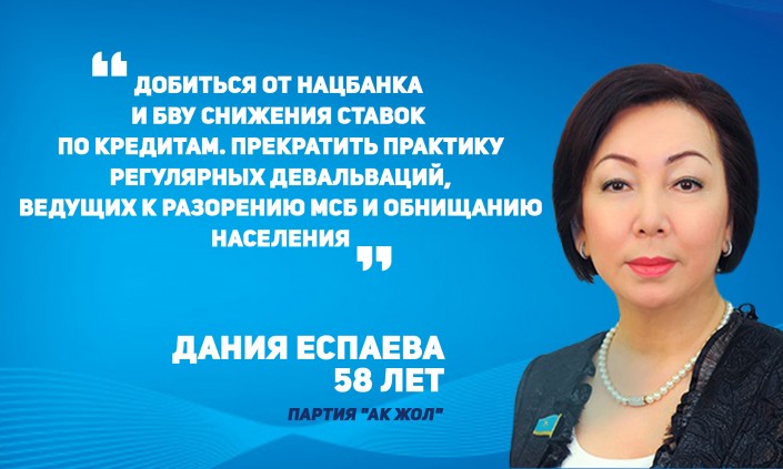 Дания Еспаева - кандидат в президенты от партии "Ак жол". Она уроженка Актюбинской области, имеет двоих детей. По специальности - экономист. Дания Еспаева более 30 лет работала в банковской сфере. Являлась членом комиссии по делам семьи и женщин Актюбинской области. В 2016 году стала депутатом Мажилиса Парламента.