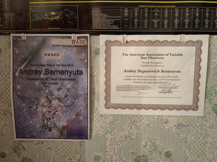 "Я окончил школу, 11 классов, у меня появилось много свободного времени. Я хотел поступить в педагогический институт, но со мной отказались заниматься преподаватели. Купил себе небольшой телескоп, поставил на балконе, ночью стал наблюдать. Просыпался, исписывал по 10 листов за ночь своими наблюдениями, это в хорошую, ясную погоду", - сказал Андрей Семенюта.