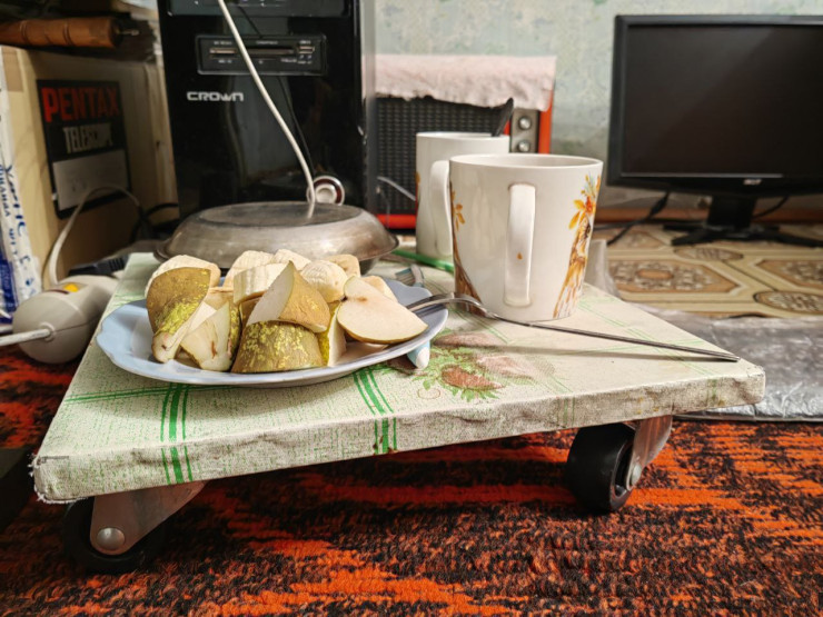 Андрей ест два раза в день – утром и вечером. На этом маленьком передвижном столике (скорее всего, это подставка под системный блок) стоит его завтрак – фрукты, тарелкой накрыты макароны с сосисками, стакан с соком.