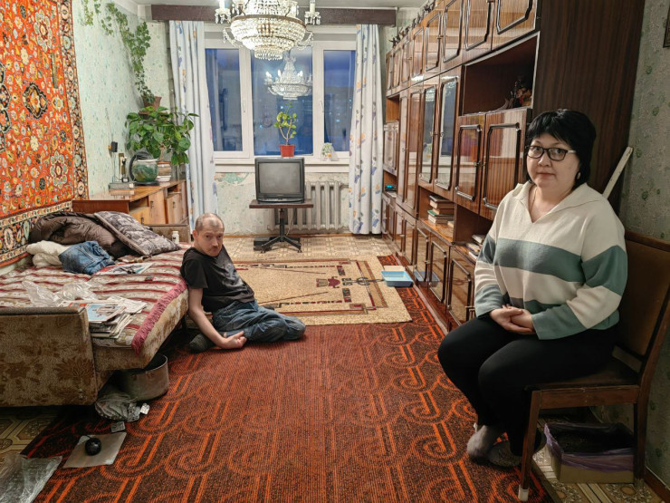 Спустилась женщина-соцработник. Открыла нам дверь. Кымбат приходит к Андрею второй год. Есть еще Самал, которая ухаживает за ним пять лет.