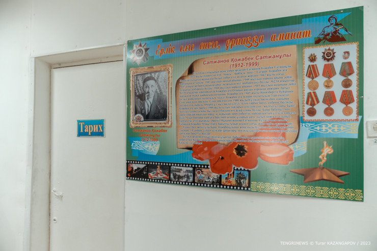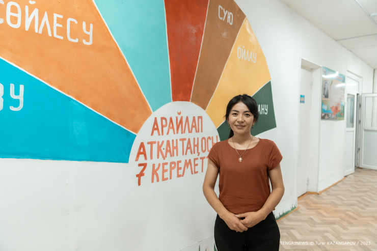 Это Арай Жумашевна, она родилась и выросла в этом ауле. После получения высшего образования вернулась работать в родную деревню. Сейчас она исполняющая обязанности директора школы.