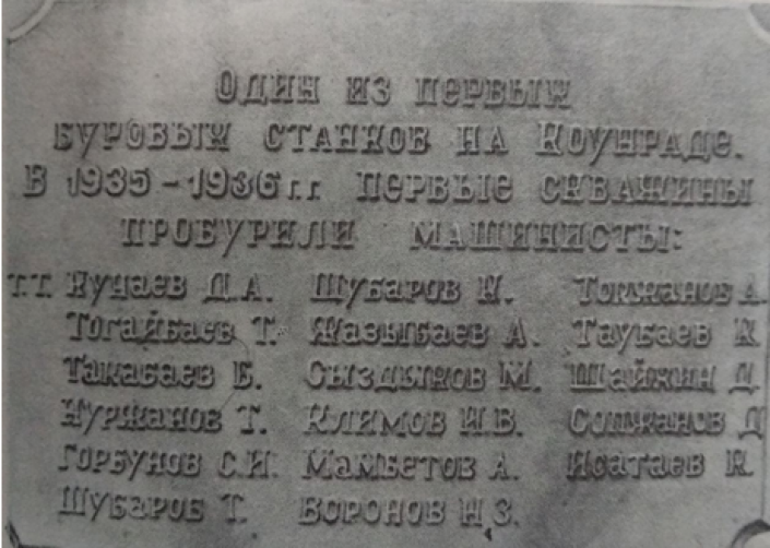 Табличка на памятном буровом станке в поселке Конырат.