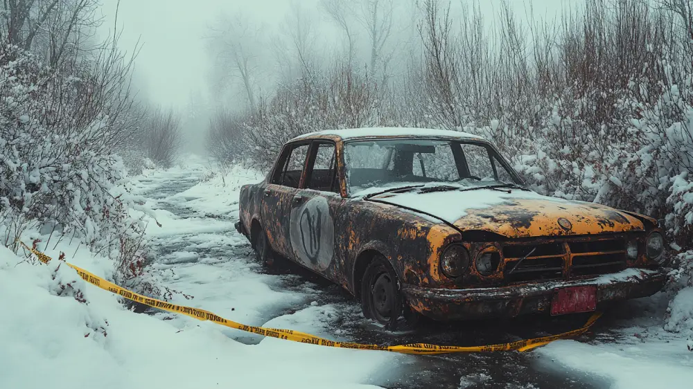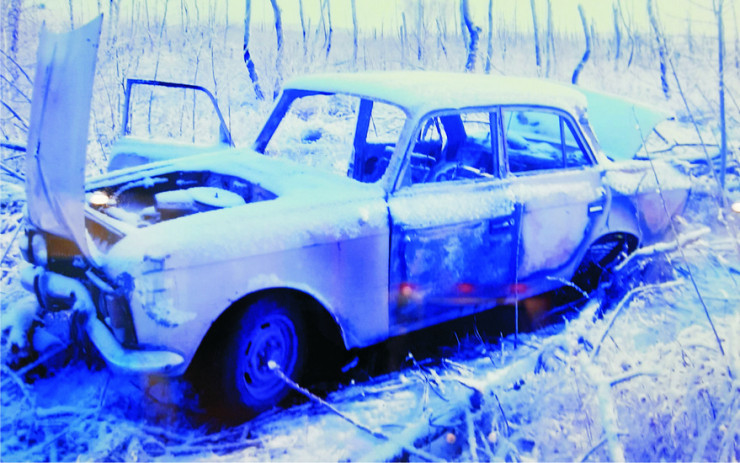 Как потом установят полицейские, преступники, когда ехали на этой машине, налетели на пень, попробовали снять "Москвич" с пенька, отсюда и появился след внизу бампера. Ничего у них не получилось, они машину бросили и подожгли.