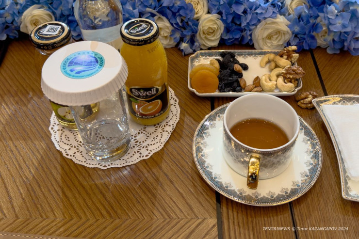 Мировые лидеры охотно пробовали угощения, предложенные казахстанской стороной. У каждого на столе были сухофрукты, орехи, вода, чай, яблочный и апельсиновый соки.