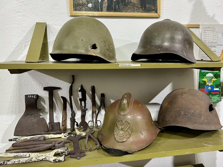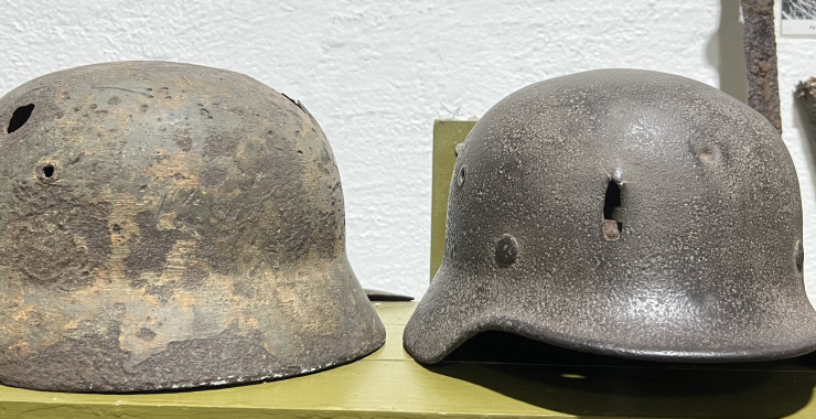 "Это немецкие каски, у немцев они были индивидуальные, личное имущество. В военном билете у них даже указывался номер каски, и если солдат погибал, каску и штык хоронили вместе с ним. Немцы вообще были очень хорошо экипированы, особенно в первые годы войны советские солдаты им в этом сильно уступали. Как-то мы нашли пожарную каску у советского солдата: когда началась война, касок не хватало, поэтому использовали и гражданские", - рассказывает Александр Азегов.