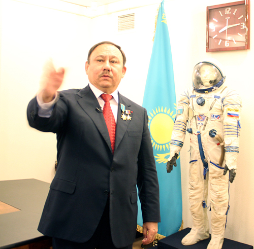 Глава Национального космического агентства Казахстана, космонавт Талгат Мусабаев в день, когда мы записались к нему на интервью, шел на рекорд. Среди представителей СМИ было много желающих побеседовать с ним в преддверии Дня космонавтики, и его пресс-служба, по всей видимости, решила, так сказать, убить всех зайцев сразу, то есть назначить в один день несколько интервью подряд. Таким образом, к кабинету Мусабаева выстроилась очередь из журналистов. Мы стояли в очереди третьими, а потому были уверены, что сил у космонавта на наши вопросы уже не останется. Но на то он и Герой сразу двух стран - Казахстана и России, чтобы быть всегда готовым идти на подвиг.