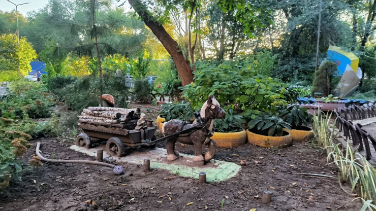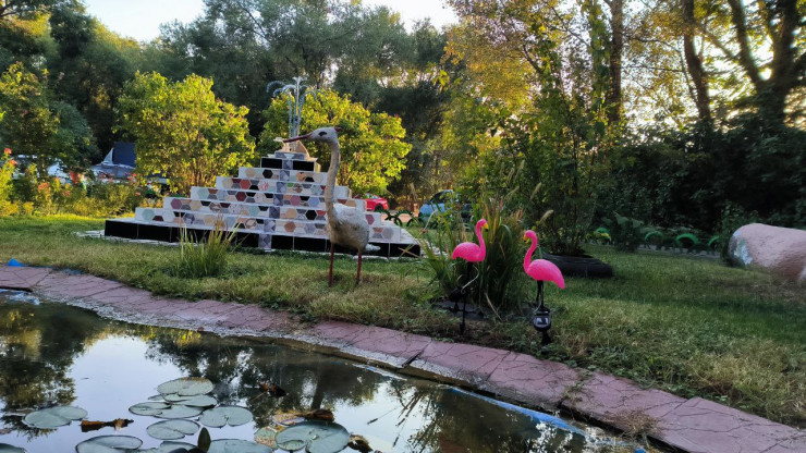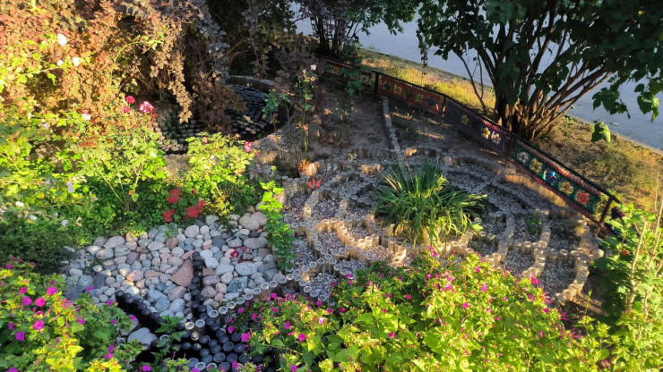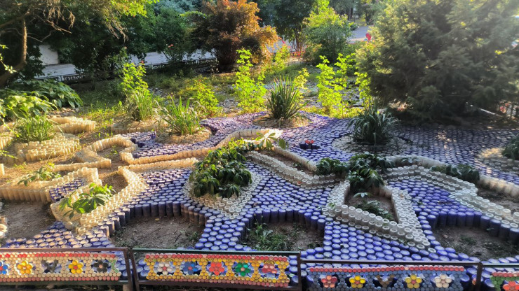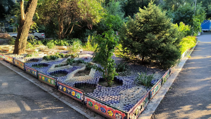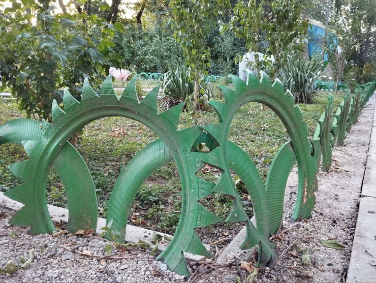 Для создания скульптур, заборчиков в ход идет все: бутылки, старые поддоны, крышки, покрышки, битая плитка.