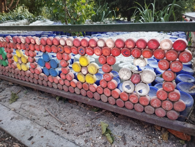 Например, этот красочный заборчик сделан из пластиковых крышек. На создание ограждения их ушло аж 20 тысяч.