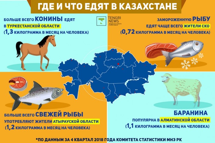 Свежую рыбу больше любят в Атырауской области, где каждый житель в среднем съедает 1,267 килограмма рыбы. А вот замороженную рыбу больше потребляют в Северо-Казахстанской области. 0,72 килограмма в месяц на человека.