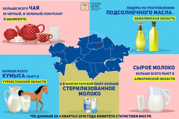 Кумыс больше всех пьют жители Туркестанской области, где в среднем один человек в месяц выпивает 0,05 литра. Молоко сырое чаще пьют в Алматинской области, где один житель в месяц выпивает 3,661 литра. Молоко ультрапастеризованное, стерилизованное покупают больше в Мангистауской области, 4 литра в среднем на каждого жителя. А молоко пастеризованное предпочитают больше в Астане. 3,2 литра в месяц выпивает один житель столицы.