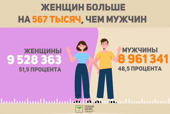 При этом женщин в Казахстане больше на 3 процента, чем мужчин. Средний возраст у представительниц слабого пола - 33,4 года, у сильной половины - 30,2. Средний возраст казахстанца - 31,8 года. В Японии, к примеру, средний возраст населения - 46,1 года, в Италии - 44,5, в Египте - 25,3.