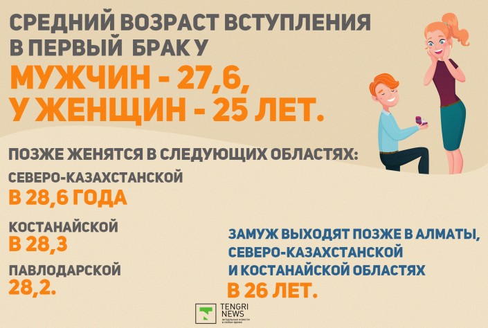 Как выяснилось, мужчины из северных регионов страны позже остальных решаются связать себя узами брака, а именно в Павлодарской, Костанайской и Северо-Казахстанской областях. При этом девушки из двух последних регионов также не спешат выходить замуж. Не торопятся в ЗАГС и жительницы Алматы.