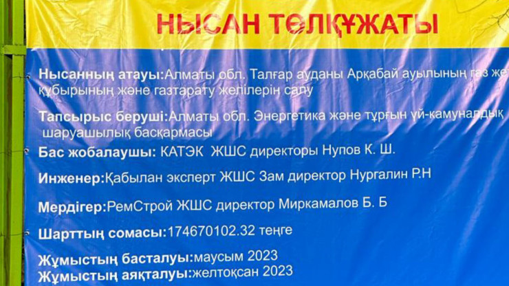 "В 2023 году, когда представители акимата и отдела жилищно-коммунального хозяйства приехали к нам, они пообещали, что до конца года газ будет подключен. Они даже повесили яркую вывеску, чтобы успокоить нас. Но все оказалось ложью. Сроки перенесли на январь-февраль, а в начале июля уверили, что акт о выполненных работах в течение недели согласуют и подпишут. На дворе конец августа 2024-го. Ничего не изменилось", — возмущается местный житель по имени Рашид.