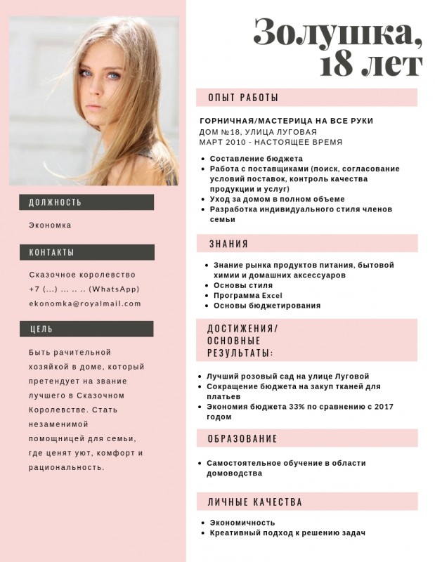 - Совершенно верно. Если бы Золушка претендовала на должность не экономки, а горничной или модистки, то это было бы абсолютно другое резюме.