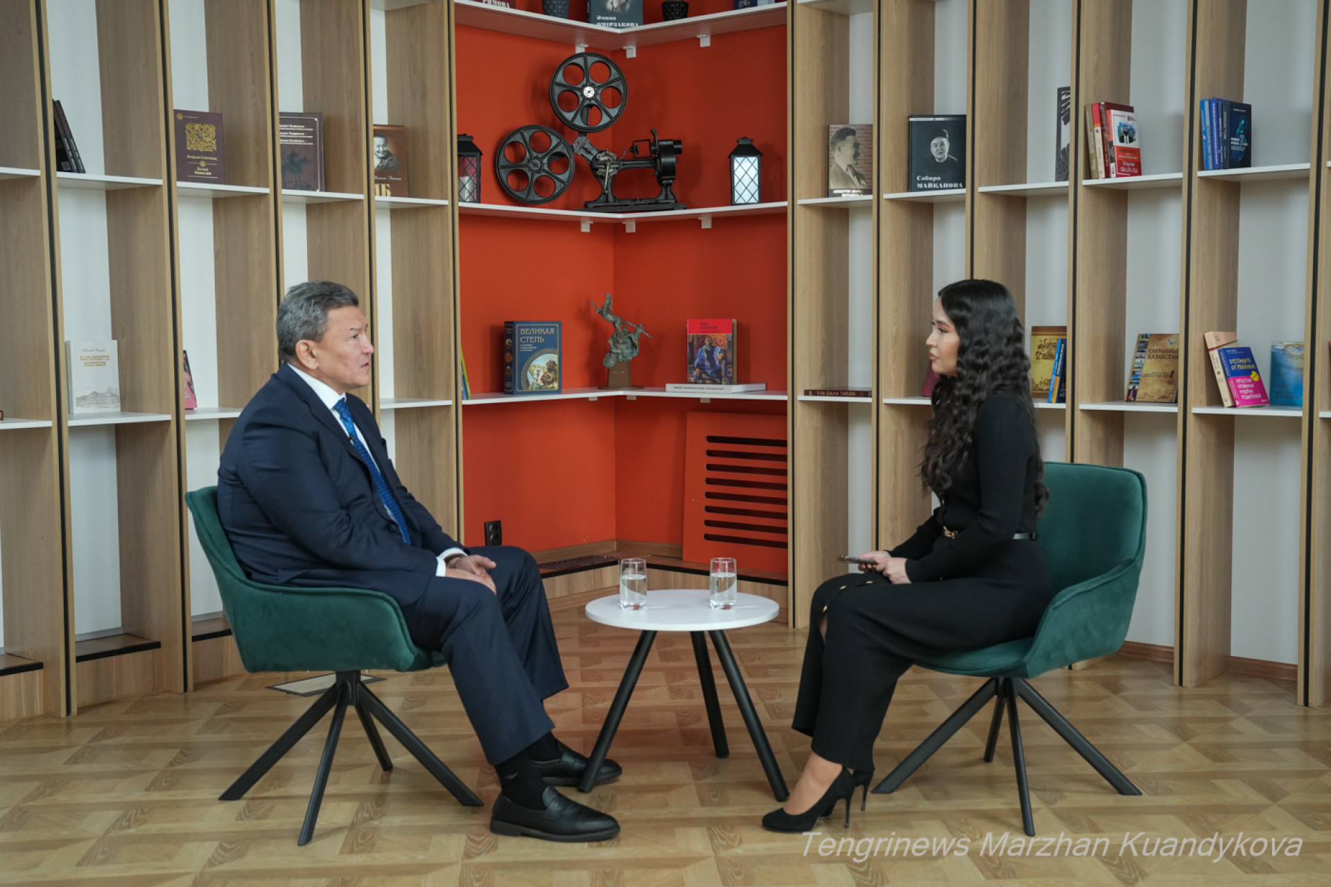 Корреспондент-редактор Аружан Дарибай беседует с акимом Северо-Казахстанской области Гауезом Нурмухамбетовым. Фото: © Tengrinews.kz / Маржан Куандыкова