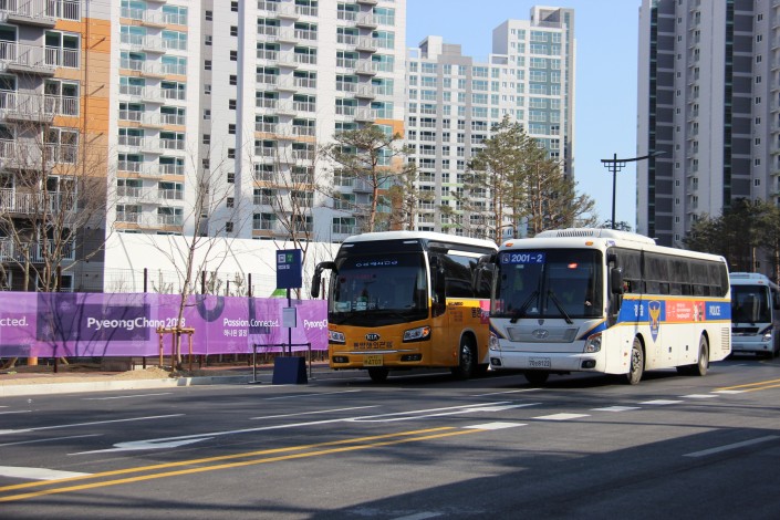 Расселены спортсмены и журналисты в новостройках, квартиры в которых потом будут распроданы. Из Каннына в Пхенчхан постоянно курсируют специальные шатлы.
