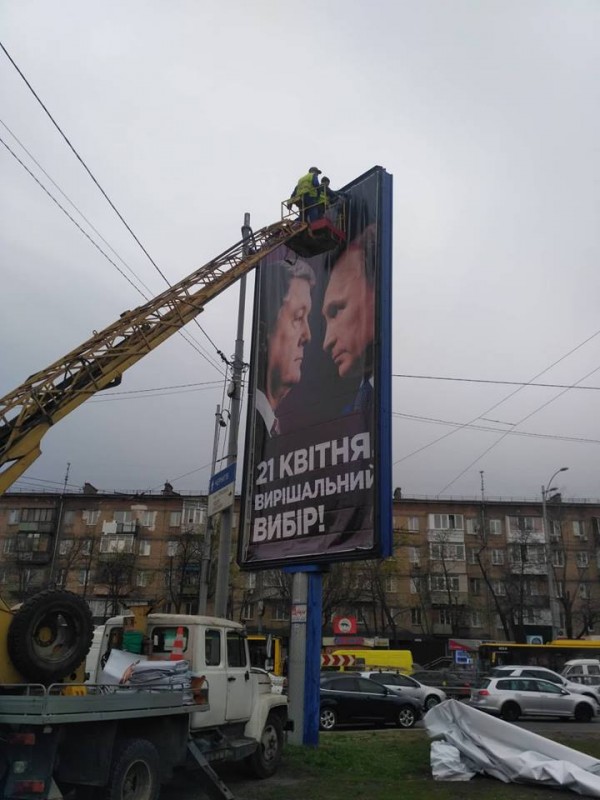 О том, что в штабе Порошенко в ход идут любые методы, свидетельствует появление "креативных" агитплакатов с изображением Порошенко и президента России Владимира Путина. Подпись внизу "21 апреля. Решающий выбор" уже никто не замечал, украинцы крайне негативно отреагировали на Путина, особенно в соцсетях. Желание у Порошенко показать, что за Зеленским стоит Путин, на плакатах потерпело крах: избиратель видел противоположное... В итоге агитка с Путиным провисела не более суток, ее спешно заменили на новую.