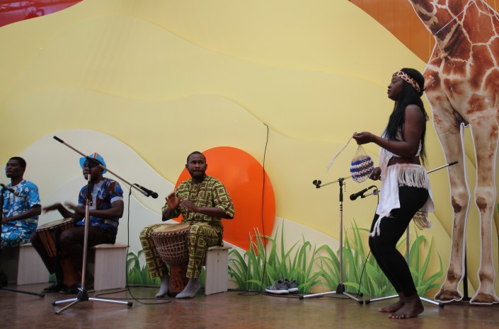 У входа в африканский павильон под ритмы барабанов танцует девушка. И сама музыка, и своеобразные движения этой африканки не дают посетителям выставки пройти мимо. Экзотика. В считанные минуты сцену окружают зрители.