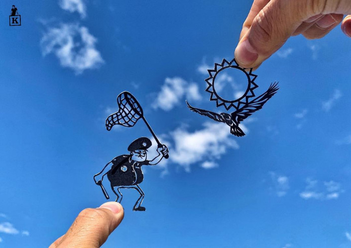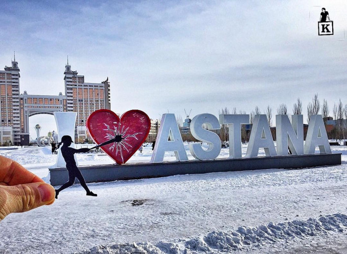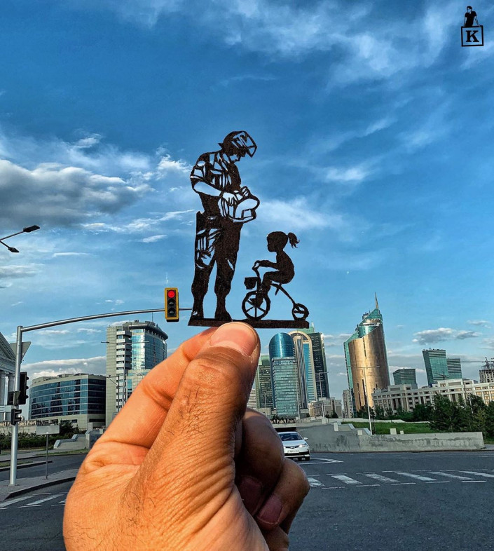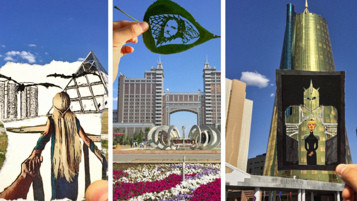 Канат - художник-самоучка. Он не только создает невероятные картины из листьев и обычного картона, но и находит необычные ракурсы, чтобы сфотографировать свои работы на улицах города.
