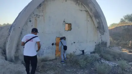 Мы осматриваем уцелевшие фрагменты военных ангаров. Волонтёр Медет объясняет: когда потерявшийся человек идёт по полю в жару, он ищет укрытия, где можно сесть и отдохнуть в тени. Поэтому каждый большой камень и остаток стены следует внимательно исследовать со всех сторон.