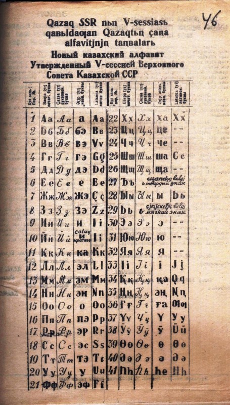 Как выглядели буквы казахской латиницы на момент замены ее кириллицей, можно увидеть здесь: