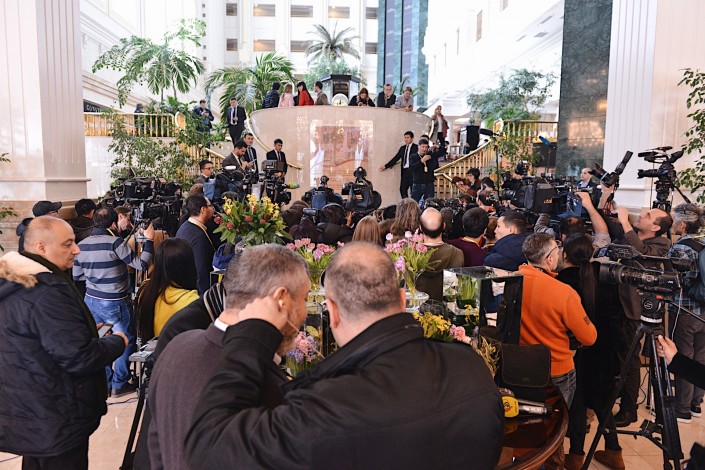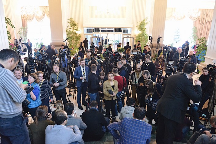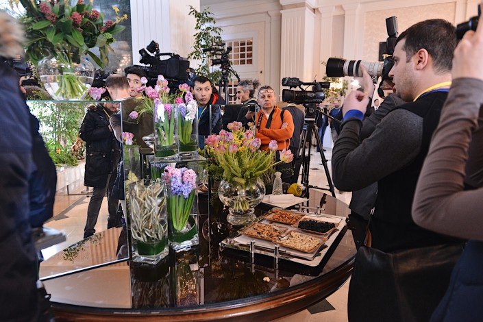 Журналисты продолжали ждать. А в какой-то момент они, по всей видимости, решили поторопить членов делегаций, но как это сделать, никто не знал, и репортеры придумали следующее: они поставили штативы своих камер прямо к лестнице, ведущей на второй этаж, и уже, кажется, решили не уходить отсюда никуда. Таким образом они полностью перекрыли проход, так что пройти незамеченным ни у кого из членов делегаций не было никаких шансов.