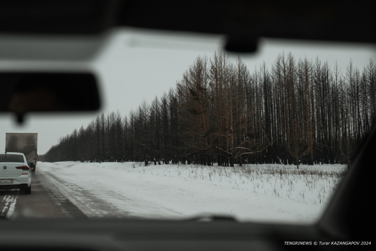 По дороге перед проезжающими машинами открывается страшная картина - почти полностью сгоревший лес.