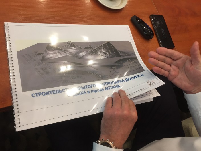 "Кстати, в Астане начали делать проект аквапарка большущего. У меня в кабинете есть первые эскизы этого проекта. Ко мне на встречу приезжали из Казахстана, хотели меня как эксперта пригласить. Просили похвалить их проект на каком-то совещании. Но я сказал, что в таком виде строить нельзя, так как никто так не делает, как там было нарисовано. Может быть, его поменяли уже, но то, что мне привезли..." - в этот момент мэр выходит из кабинета и приносит проект.