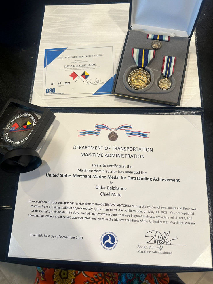 Героический поступок Дидара Байжанова не остался незамеченным. В феврале департамент транспорта Соединенных Штатов наградил отважного офицера медалью за "Выдающиеся достижения" (на фото ниже). Данную медаль присуждает морская администрация департамента через федеральное правительство США. Сам Дидар считает награду заслугой всего экипажа и слаженной работы всей команды судна.