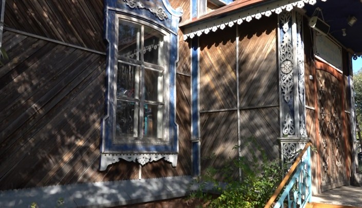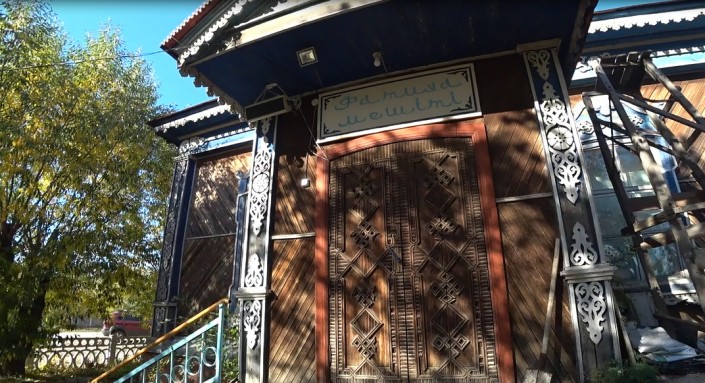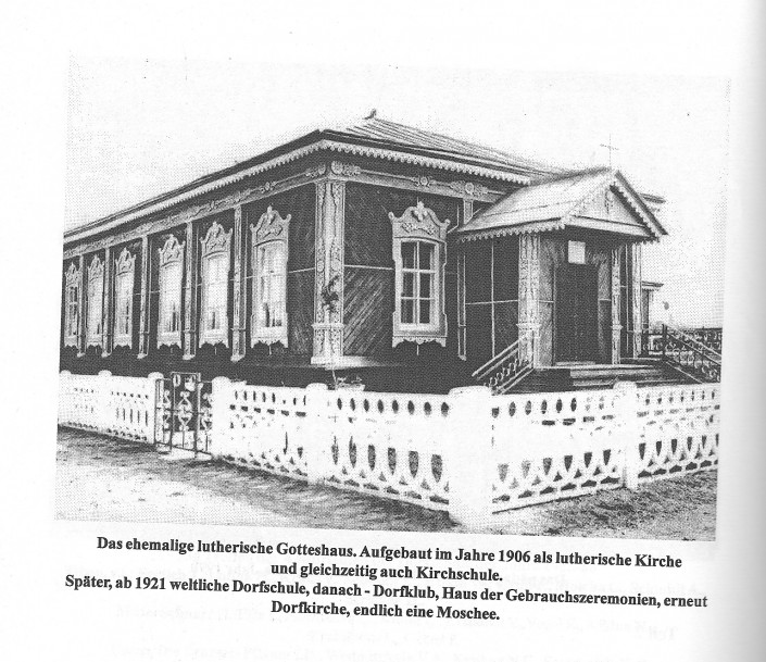 Старинный деревянный дом с куполом - сейчас мечеть. А до отъезда немцев в начале 90-х в этом здании располагалась церковь.