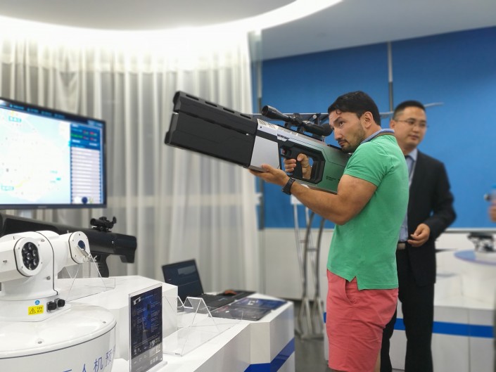 И хотя это устройство и выглядит внешне как оружие, оно ничем не стреляет, а просто блокирует связь дрона. "Это уже третье поколение антидрона, в него встроен радар, чтобы обнаружить дрон. Потому что сейчас дроны сильно угрожают общественной безопасности, ведь для них высокие стены и заборы уже ничего не значат", - говорит Антон и отмечает, что дальность действия устройства составляет 500-600 метров.