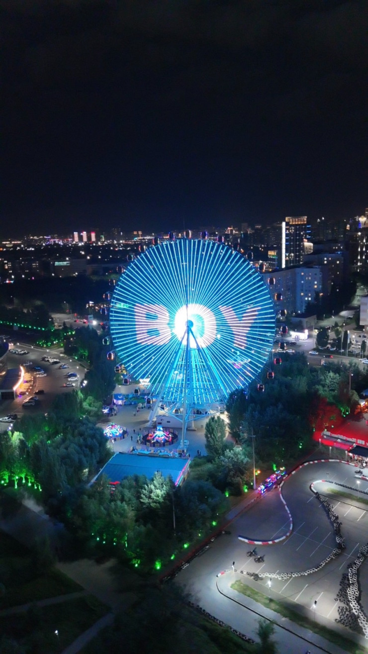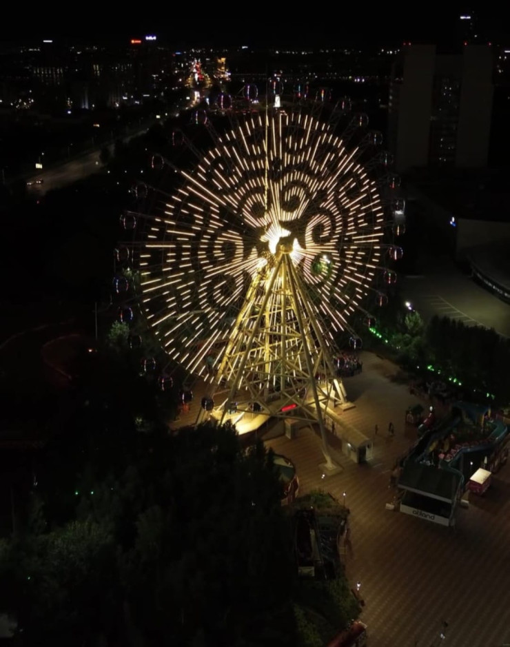 Построенное в 2017 году к международной выставке EXPO, 65-метровое колесо обозрения в Астане продолжает оставаться самым высоким в Центральной Азии. Его можно по праву считать одним из узнаваемых символов современной Астаны. В нынешнем году, ко Всемирным играм кочевников, аттракцион заметно преобразился. Помимо красивой декоративной подсветки теперь на нем можно показывать видеоролики к государственным праздникам, рекламу, поздравления и многое другое.