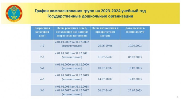 Графики летнего комплектования составляются городскими управлениями или отделами образования. В Астане в текущем 2023 году набор групп в государственные дошкольные организации начался с 1 июля 2023 года. Отметим, что свободные места сначала поступают в приоритетный доступ. Спустя 3 рабочих дня (период может быть изменен ответственным госорганом) оставшиеся места передаются в свободный доступ.