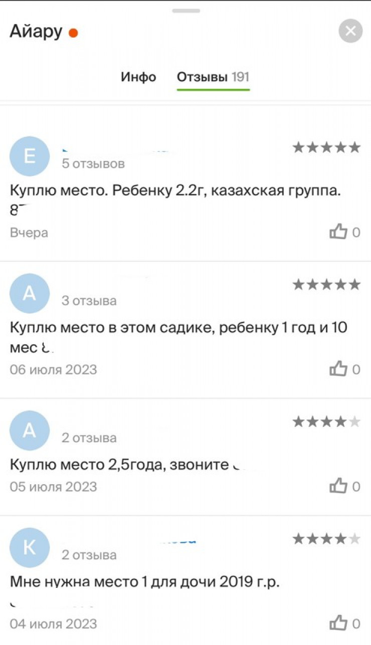 "Мы живем в районе Экспо (левый берег), где нет ни одного государственного сада в пешей доступности. Ближайшие находятся минимум в 25 минутах ходьбы. Но и в этих садах уже нет мест. За 4 дня, с 1 по 4 июля, все разобрали "приоритетники", коих в Астане большое количество. В 7 часов утра 5 июля были доступны места только в один государственный сад на левом берегу. Поэтому, конечно, люди готовы за денежное вознаграждение искать места. Откройте в приложении "2ГИС" отзывы к любому госсаду на левом берегу, и вы увидите настоящий спрос", - рассказала редакции одна из столичных мам.