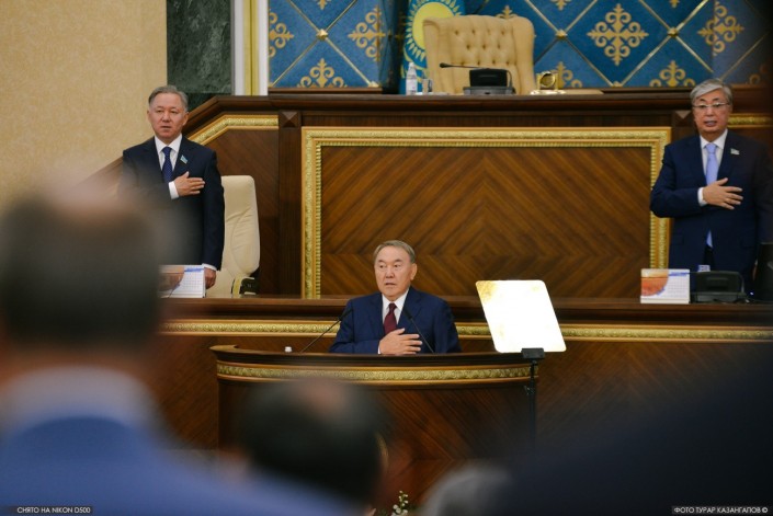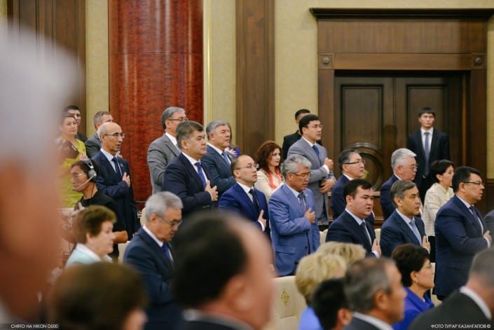 Заиграл гимн Казахстана. Все собравшиеся, включая Нурсултана Назарбаева, приложили руку к сердцу. Слышно было, как поверх фонограммы звучит чей-то реальный голос. Кажется, это пел Нурсултан Назарбаев. Судя по движению губ других политиков, они тоже пели, но их не было слышно. Журналисты, наблюдавшие трансляцию открытия парламентской сессии по мониторам в пресс-центре, могли видеть, как старательно открывают рты другие участники заседания, например, председатель Нацбанка Данияр Акишев (ему Назарбаев чуть позже предложит дать больше полномочий для воздействия на коммерческие банки, чтобы не повторилась ситуация, которая имела место когда-то с банком БТА).