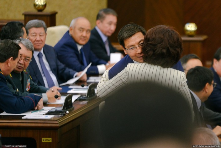 Это фото было сделано в самом начале заседания, еще до того момента, когда Назарбаев оценил порядочность Досаева. Но, глядя на него, может сложиться впечатление, что снимок сделан уже после слов Президента. Обратите внимание как коллеги вице-премьера, тоже заместители главы правительства Аскар Мырзахметов и Аскар Мамин (а есть еще и третий заместитель премьер-министра по имени Аскар - вот такое совпадение), одобрительно поддерживают его.