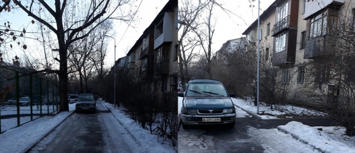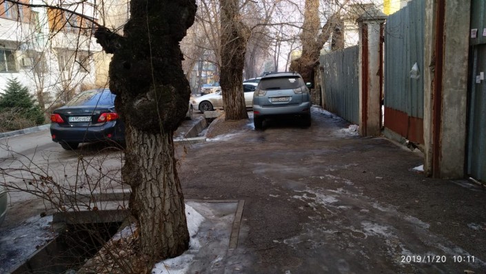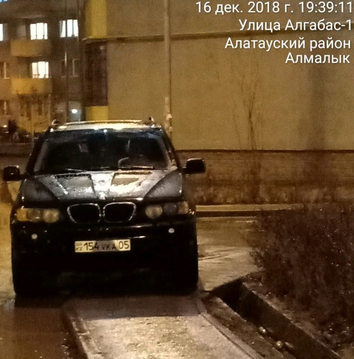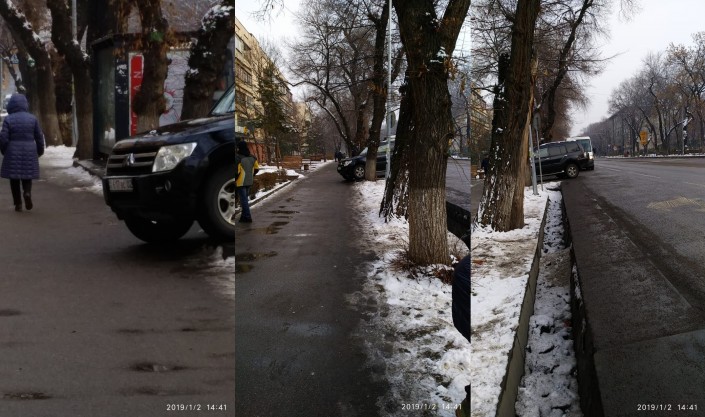 Фото этого нарушения нам прислали в середине декабря 2018 года. Житель микрорайона Алгабас-1 в Алматы зафиксировал парковку сразу двух автомобилей на тротуаре.