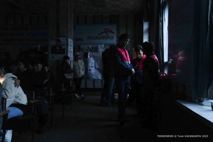Родственники шахтеров, находившиеся в актовом зале, сидели в темноте около 20 минут и читали последние новости со своих телефонов.