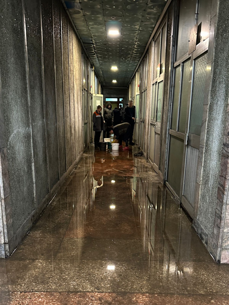 Пока в актовом зале родные шахтеров ожидали новостей об их судьбе, внизу, на первом этаже, устраняли прорыв на водопроводной трубе.