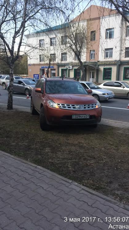 На проспекте Абая, между улицами Мамбетова и Ауэзова, водитель Nissan с номером 329NYA01 припарковался на газоне.