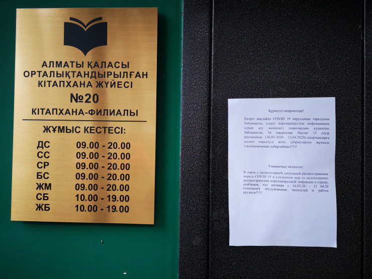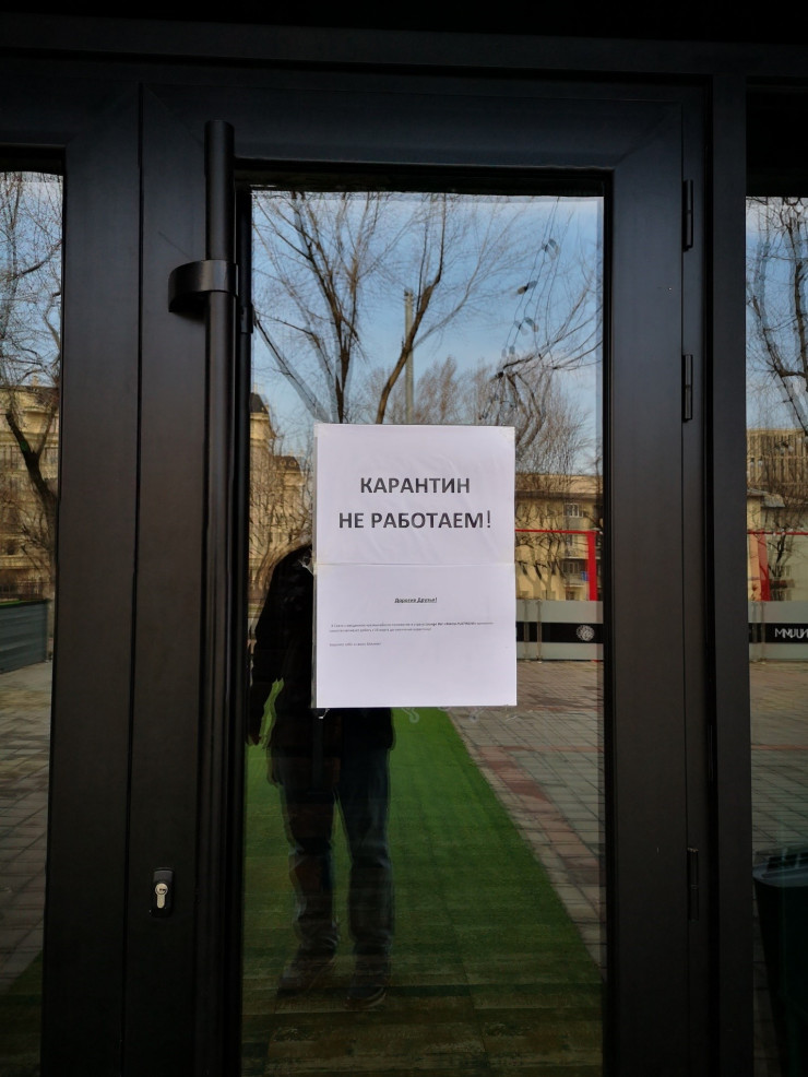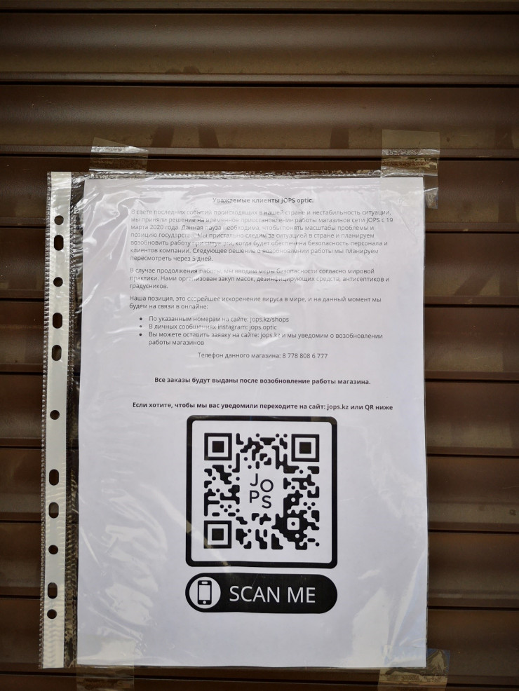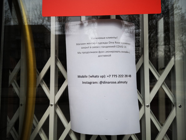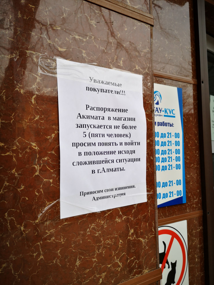 На входе обращение к покупателям: "Распоряжение акимата. В магазин запускается не более пяти человек. Просим понять и войти в положение исходя из сложившейся ситуации в городе Алматы".
