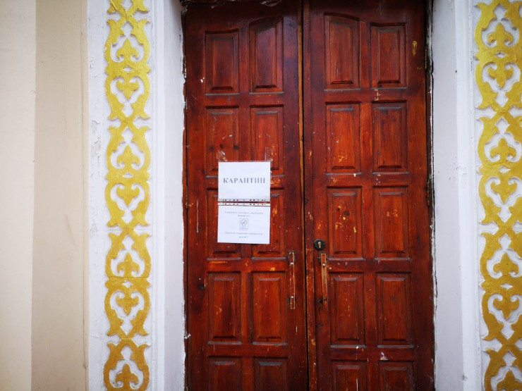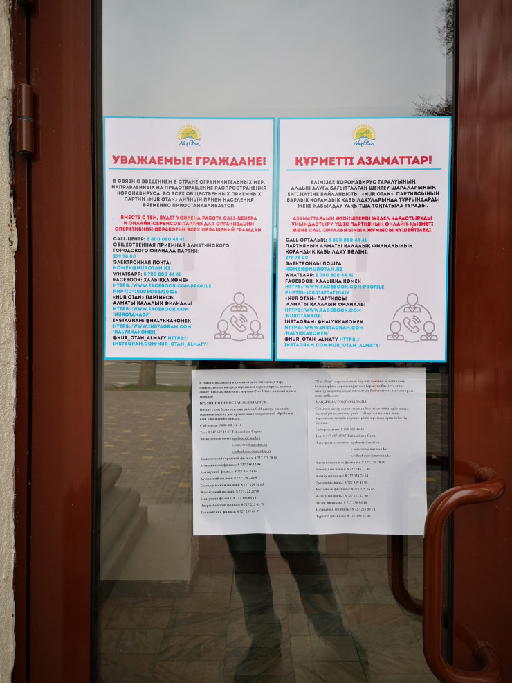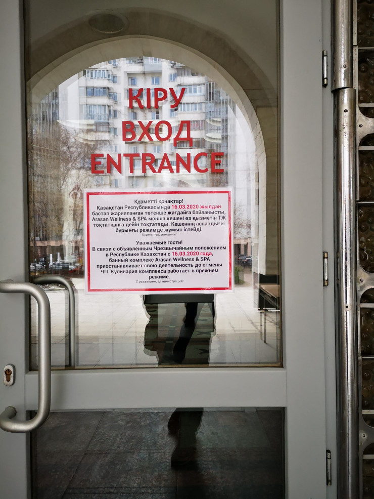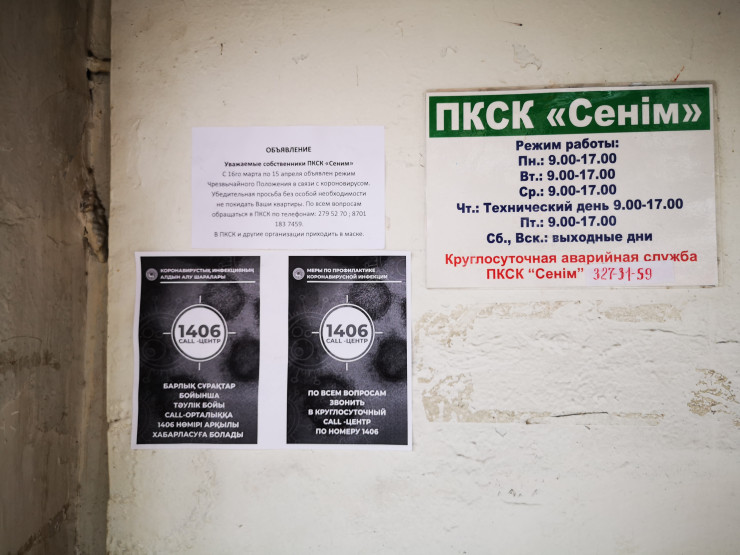 В одном из зданий напротив городского акимата висит объявление о том, что на протяжении нескольких дней будет проводиться дезинфекция с использованием активного хлора высокой концентрации.
