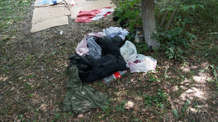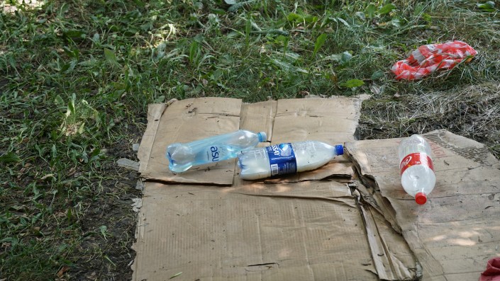 Здесь разбросаны какие-то вещи, бутылки и матрасы. Того человека, который чуть ранее прилег сюда отдохнуть, уже на месте не было.