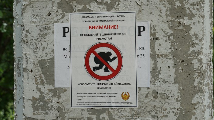 На заборе бросается в глаза обращение управления криминальной полиции Астаны к жителям, чтобы те были бдительны и не оставляли ценные вещи и велосипеды без присмотра.