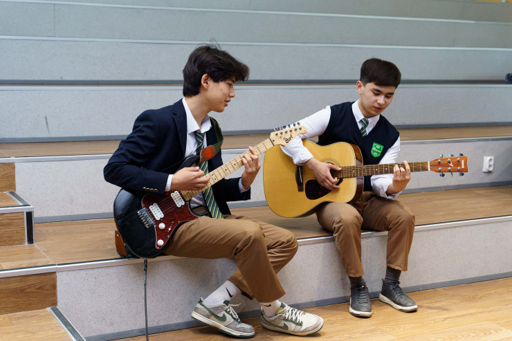 После беседы с учащимися журналисты направляются во второй корпус под названием Freedom House. Здесь центральный объект – сцена с множеством ярусов сидений, где мы застали нескольких учащихся, играющих на музыкальных инструментах – гитаре…