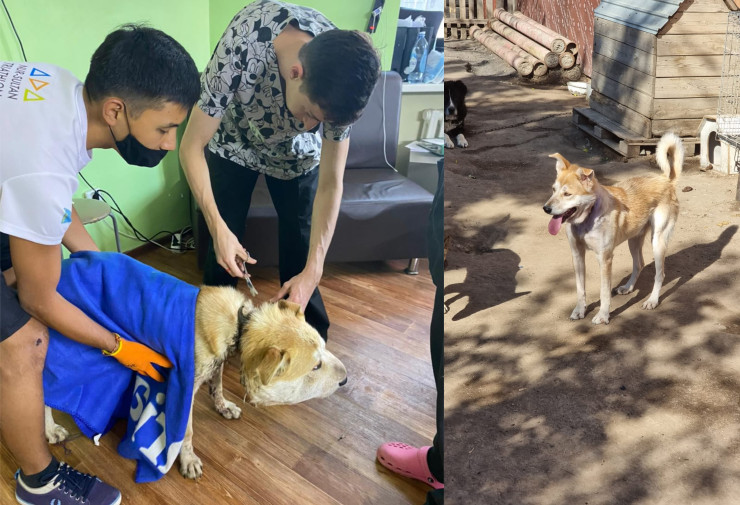 Фото предоставлены Гульмирой Назырхановой"В селе Жибек жолы как-то несколько дней бегал пес с перевязанной шеей. Там уже пошел отек, веревка впилась в плоть. Всем миром его спасали, потому что он убегал, он боялся людей. И неравнодушные выезжали и ловили его. Отрезали веревку. Врачи сказали, что еще чуть-чуть и веревка пережала бы трахею. Долго лечили, потом в приют забрали, там обрабатывали".
